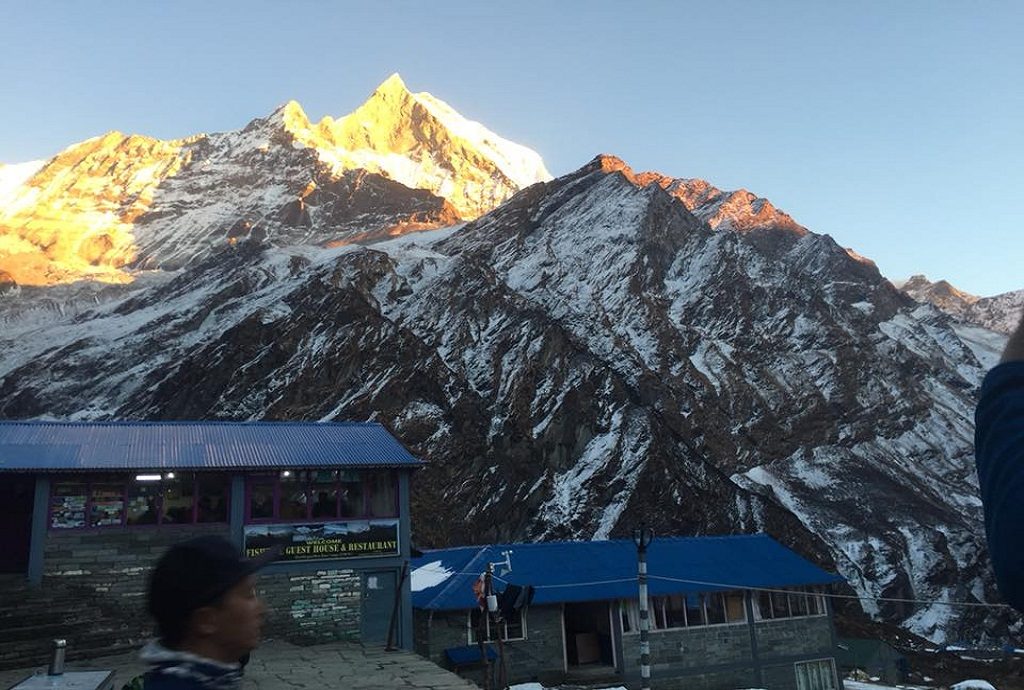 On the way to the Himalayan Hotel and Machhapuchhre Base Camp, you can experience walking in snow during winter. Make sure to have the latest information on trail conditions or hire a knowledgeable guide and proper trekking equipment. We customize trip plans based on your time and budget. For groups, special prices are available. Sunrise Adventure Trek is your complete travel guide for customizing your trip according to your preferences. Lodges in the Annapurna Trekking Region are well-equipped with extensive menus, including Western food and Nepali dishes like “Dal Bhat” (rice with lentils), pizza, and Chow Mein. Hot showers are readily available at hotels. After finishing the trek, return to Pokhara and drive to Kathmandu.